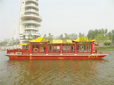 畫舫船就是裝飾古典華麗的游船,是"中國風"的仿古游船,結合古典園林建筑,體現了中華文明的古典藝術.畫舫船豪華而又古典,船上的建筑按照中國古代建筑里的亭臺樓閣,建筑工藝之復雜,要求之嚴格,仿古畫舫游船的特點飛檐翹角、玲瓏精致的四角亭子逐漸成形,赫然立于船頭,美人靠、盤龍柱子、彩畫……龍柱上的浮雕盤龍和祥云一層扣著一層,層層錯落有致,雕刻精細到盤龍身上的每一個鱗片都細細可數,古代皇家標志性元素,在畫舫船上體現的淋漓盡致。除了雕刻、花窗,整條船還有一個看點,那就是弧線優美、高高翹起的船尾。游船并不大,長約10米、寬3米,但是整體看起來堪稱一件藝術品。船尾的雕花欄桿與船艙、船頭的雕刻遙相呼應,船身四周貼著浮雕祥云,給整條船增添了富貴、華麗的氣質。